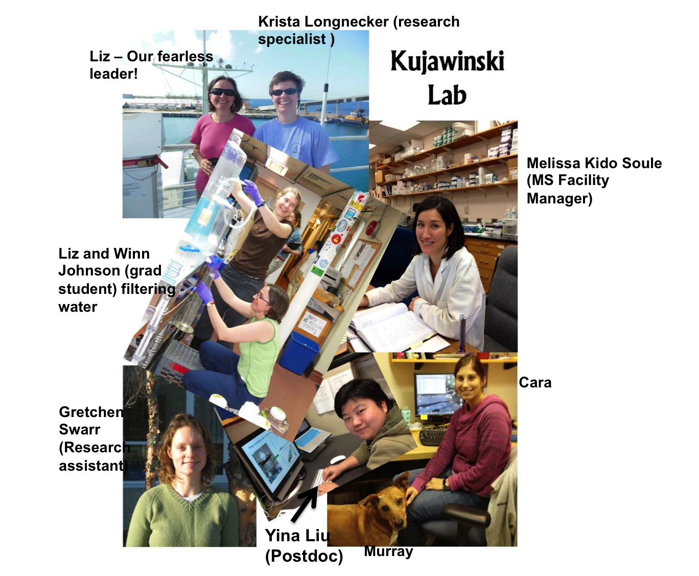 Cara Fiore has worked on diverse research projects from invertebrate ecology to medical biology. Cara received a B.S. in biology from SUNY Cortland, and graduated from the College of Charleston (Grice Marine Lab) and the University of New Hampshire before starting a postdoc at WHOI. Cara spent 10 days underwater in the Aquarius Habitat during her graduate work - see the press & media section.Elizabeth Kujawinski is an associate scientist with tenure in marine chemistry at WHOI. Her research interests reside at the intersection of environmental chemistry and microbial ecology and she uses advanced analytical chemistry tools to answer questions about microbe-chemical interactions in aquatic systems. She received her PhD from the MIT/WHOI Joint Program in Oceanography and completed postdoctoral research at The Ohio State University. She has been at WHOI since 2004.