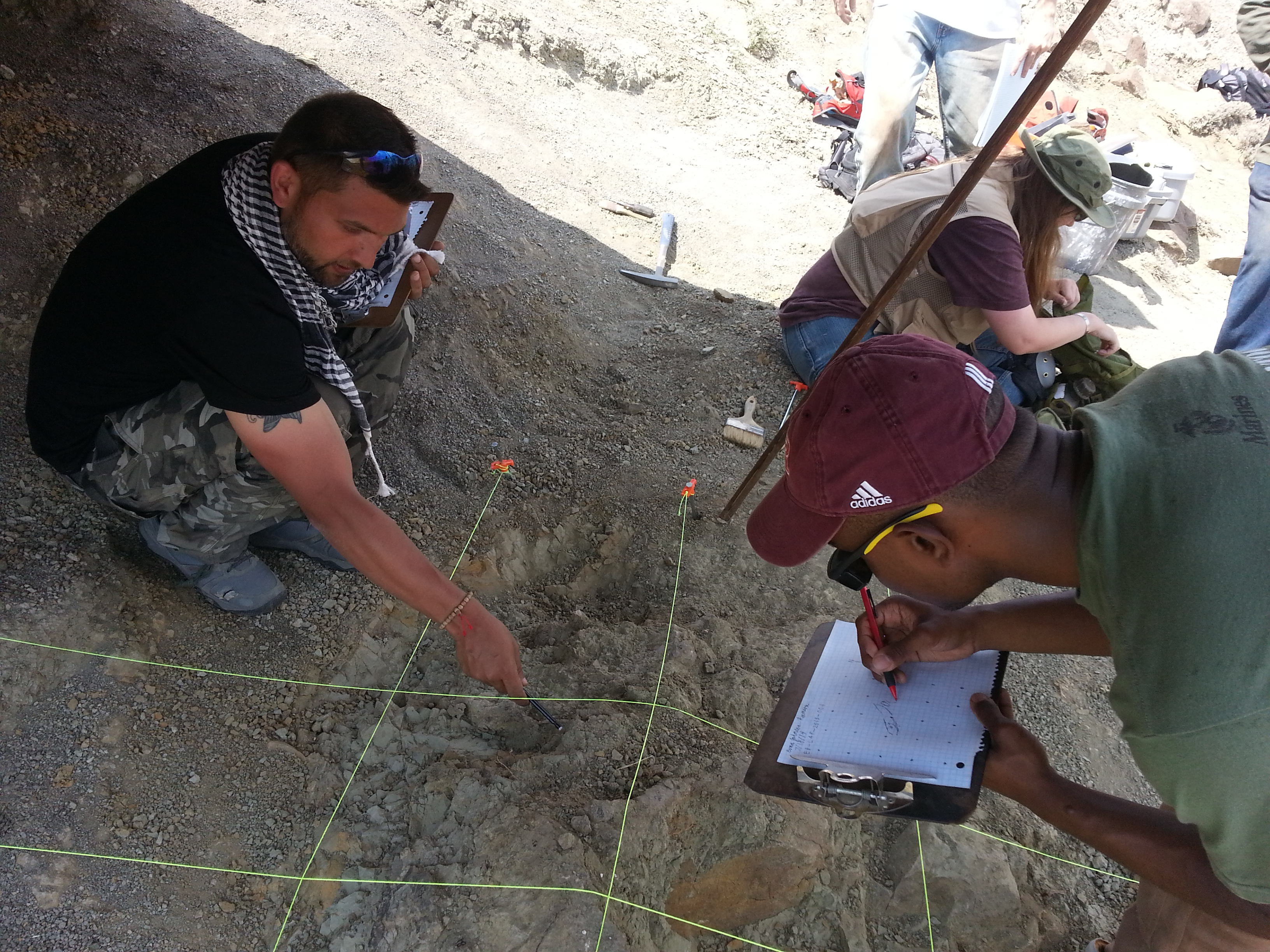 Members of the 2013 Field Crew finding "float," or eroded fossil bone on the ground surface, and hoping it will lead to more bone in the ground.