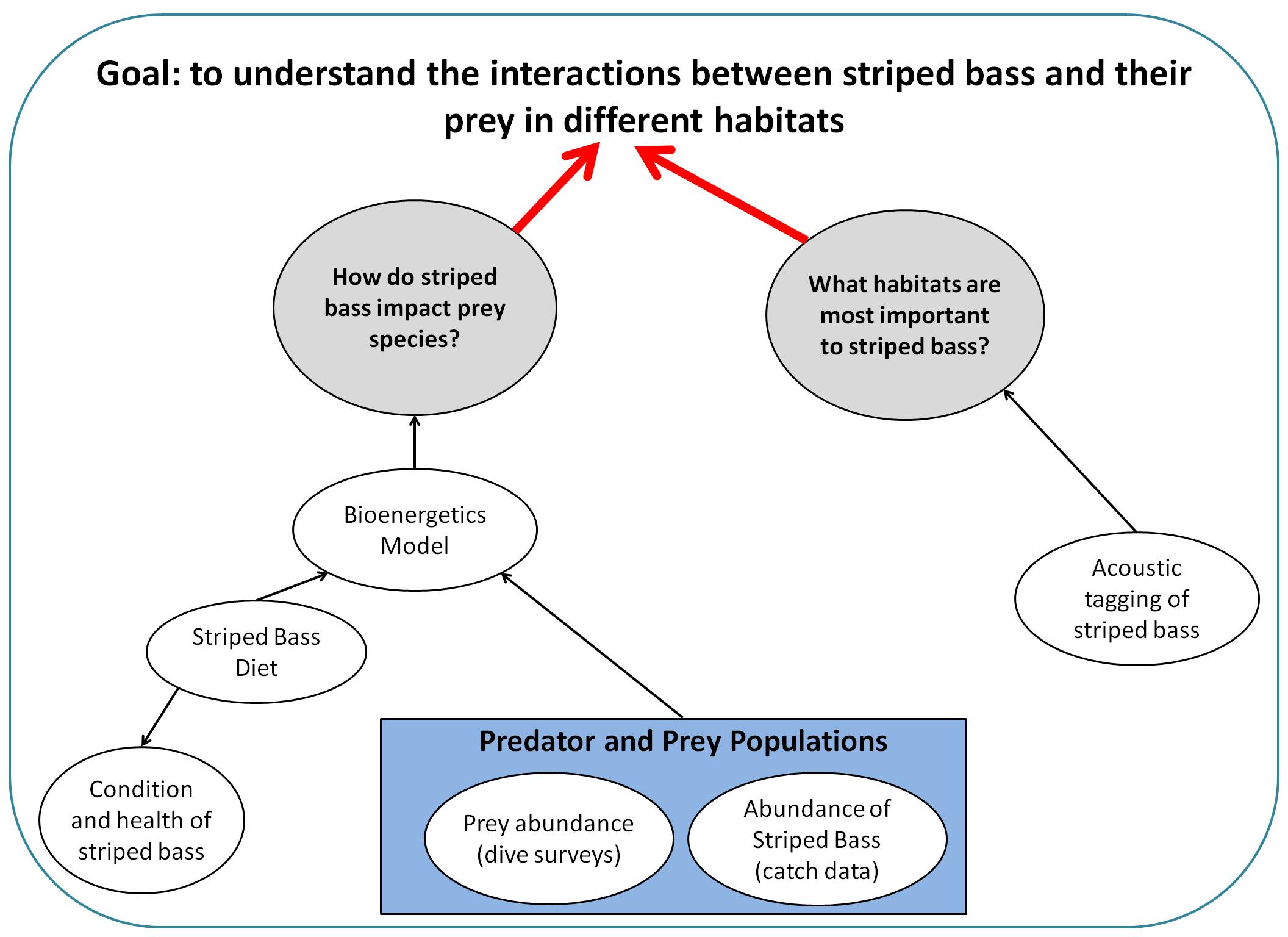 - What habitats are most important to striped bass during their migration? Acoustic tags will be surgically implanted into fish in order to determine how striped bass use local habitats. This will give us insight into where striped bass may have the most impact, and conversely, which habitats are most important. (See 'Lab Notes')